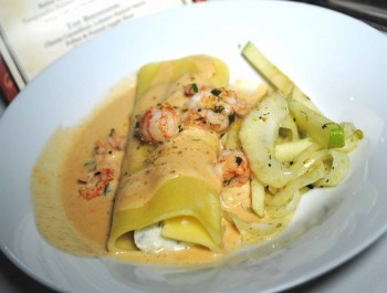 We then adjourned to the dimly lit cave room where tables with flickering candles were beautifully set to evoke a magical, romantic mood. As a first course, Chef Dean outdid himself with one of his innovative creations: cheese cannelloni in a lobster and fennel sauce with a crispy apple slaw. The accompanying 2014 C’est La Vie Viognier was mellow and light, enhancing the savory flavors of the cannelloni dish.