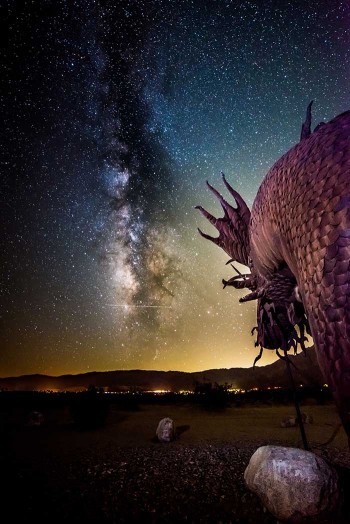 Arriving in Borrego Springs in the daytime is important. I have to scout the sculptures. There are over 130 statues to choose from, as this prolific artist is given free rein to populate Galleta Meadows with his welded statuary.