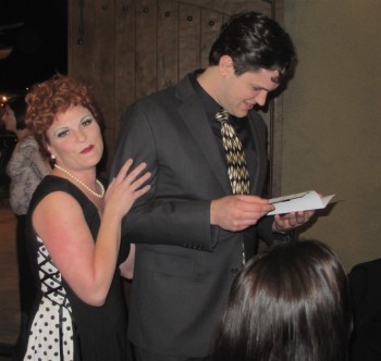 With mellow lighting in a nightclub-like setting full of mystery and ambiance, Europa’s Cave was perfect for the crime scene and also for another of Chef Dean Thomas’ wonderful meals. Expertly directed by Brittany Campbell and cleverly scripted by Tony Lou Productions, the play was presented in three acts between courses. Ricky, played by Justin Duchi, was the perfect suave, charismatic bandleader, always wary of his wife’s ongoing antics. Lucy, played by Beverly Baker, wanted to be a star as usual and she and Ethel, played by Tiffany Aptaker, hilariously impersonated gangsters in order to get into the nightclub. Fred was played by Europa favorite, John Campbell, whose booming voice and comic facial expressions enhanced his role as Ethel’s bumbling but loveable husband. Shaye Leeper, playing Celia B. DeMilo, was the quintessential dumb, gorgeous blonde bombshell. The notorious gangster, Mr. Big, was hysterically played by Luigi Monteleone. As these colorful characters frolicked about our tables, we all felt like we were part of the nightclub scene.