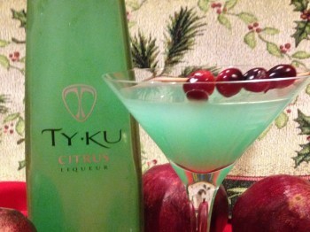 For a Christmas-colored cocktail, try a beautiful green Ty Ku Citrus Liqueur libation garnished with bright, dark red Bing cherries, fresh cranberries, or pomegranate seeds.  Ty Ku Citrus, a Japanese barley spirit, contains green tea, honeydew melon, and exotic superfruits: yuzu, a citrus with a grapefruit-like flavor; mangosteen, a sweet, fragrant fruit; and gojiberry, a high-protein, tart berry.  An added plus is that this flavorful liqueur has only 60 calories per ounce. Note:  the Ty Ku bottle is supposed to light up when a button is pushed on the bottom, but I couldn’t get my bottle light to work.  You may want to check out the light before purchasing the bottle.