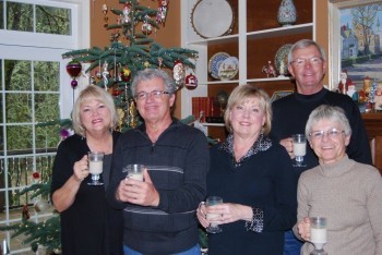 The author enjoys hot buttered rum with friends. Left to right: Linda Stewart, Bob Miller, Terri Miller, Caralee Taylor. Back: Bill Taylor