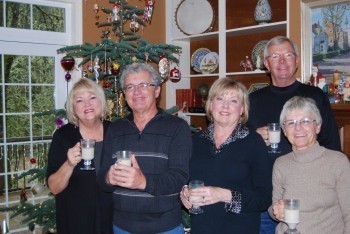 (Photo to the right is of a gathering with friends a few years ago as we savored Hot Buttered Rum. Left to Right: The author, Linda Stewart; Bob MIller; Terri Miller; Caralee Taylor. Back: Bill Taylor)