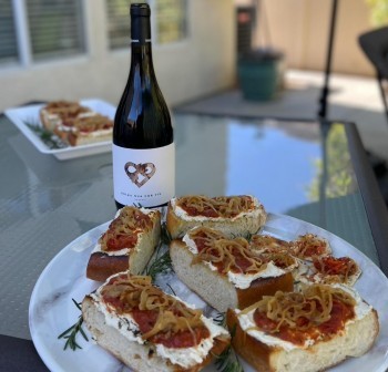 We also especially enjoyed the Anima Nua Cor Viu 2019 from Cellers Domenys. This rich deep red Tempranillo from the Barbera Basin was bursting with fruit and cherry tastes but also elegant and soft on the palate. We paired it with a classic Spanish dish, Pan con Tomate with Gueso de Cabra (bread with tomato and goat cheese). The match was perfect with the tomato bread enchancing the wine and vice versa.