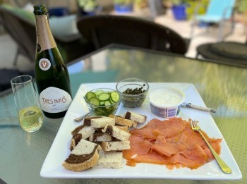 Appropriately, we began our tasting with Cava Tres Naus, a lovely sparkling wine that was produced in the Catalonia region by Cellars Domenys using traditional methods. We learned that it was first fermented in stainless steel and later a second fermentation took place in the bottles. This refreshing brut was characterized by fine bubbles, a pale yellow color, an enticing floral aroma, and light tastes of grapefruit, rosemary, and lavender. This delectable brut enhanced the flavors of an appetizer of smoked salmon, capers, red onion, and cream cheese on rye bread.