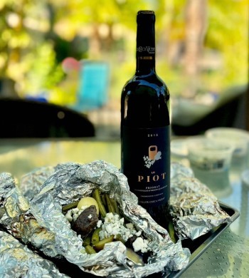 The next red was a luscious Lo Piot 2015 from the Priorat region in the Montsant river basin. This vibrant wine is a blend of Grenache, Merlot, Carignan and Syrah that had been aged in oak barrels for 12 months, producing a spicy, fruity wine with lots of minerality. We paired this flavorful wine with tasty packets of grilled steak and potatoes topped by blue cheese and rosemary. The boldness of the wine was a nice match for the rich, flavorful steak.