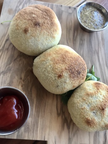 Debbie, who is a very creative person and a self-described “foodie,” designed the initial menu. As a fellow Nebraskan, I could not wait to try the Bierocks, a salute to our native state’s famous dish called Runza. These individual small buns are filled with hamburger and cabbage and served with a beer mustard dipping sauce. (If you want to be authentic, ask for a side of ketchup for dipping.) Debbie told me that Doug loves “all things” burger and all kinds of pizza so she made sure these favorites are on the menu. We also tried one of my favorites, the Maple Bacon Wrapped Dates, stuffed with mascarpone cheese and pistachio and cooked to perfection with the crispy, crunchy outside of bacon and the gooey date inside.