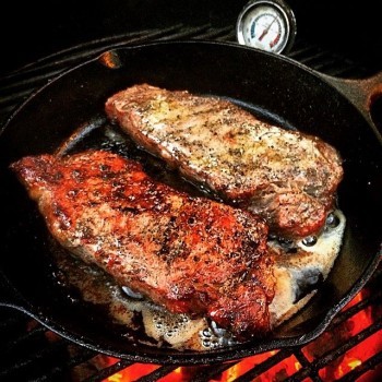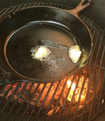 David then puts a cast iron skillet on the grill, adds butter, and waits until butter sizzles before adding more butter. (As a chef friend of mine says, "butter is your friend.")