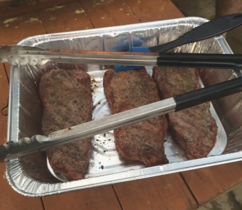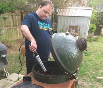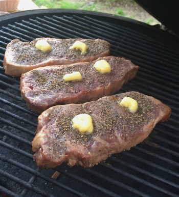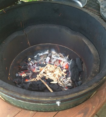He added hickory chips to the burning charcoal. Since the steaks need to be grilled with indirect heat, David used the place setter in his ceramic komodo style smoker (Big Green Egg) to keep the flames from the steaks. On a Weber grill, you can put charcoal on only one side of the grill and grill the steaks on the other side.