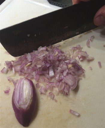 While the steaks were resting, David started to prepare ingredients for what would become a delicious wine reduction sauce that would enhance the grilled steaks. First, he chopped medium-sized shallots—one for each steak.