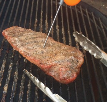 Pull the steaks off the grill at 10 degrees lower than your goal temperature. So, in our case, we wanted medium steaks so we took them off at 125 degrees. For rarer steaks, obviously the goal temperature would be lower. Here David tests the temperature of the steak to make sure he takes them off at exactly the right time.