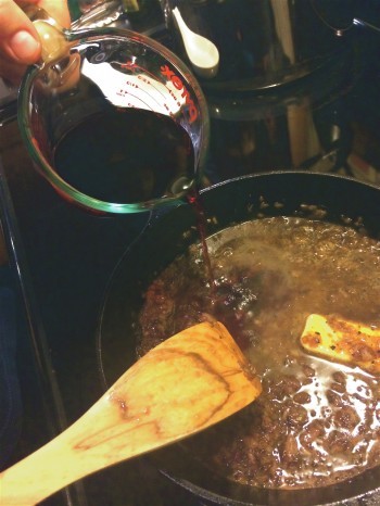 Now it's time to make the wine reduction sauce. First glaze the same cast iron skillet that has the meat's juices with wine. Add the chopped shallots and 2 tablespoons of butter and simmer. Then add about a cup and a half of a rich, red wine. Next add about 4 more tablespoons of butter. David points out that European butter, which he uses, has more fat and more protein and works well in this sauce. Cook until the sauce thickens.