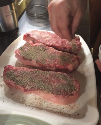 Of course, another key to the perfect steak is to choose great meat in the first place. These Choice New York strips were from one of David's favorite butcher's, Porcellino's in Memphis. Their steaks come from Claybrook Farms, a local farm where the cattle are mostly grass-fed. David chose well-marbled steaks that were about 1-1/2 inches thick. First he seasoned them generously on both sides with ground peppercorns and Himalayan sea salt. The seasoned steaks need to sit for about 30-60 minutes so they can absorb the seasonings.