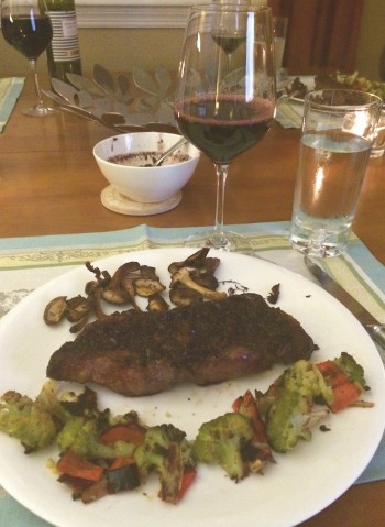 Now the best steak I have ever tasted was served. David's wife, Susan, had prepared roasted vegetables with fennel, olive oil, salt and pepper for the delicious accompaniment, along with sauteed shitake mushrooms. We all agreed that these steaks tasted much better than ones just slapped on the grill. David's bit of extra effort was well worth it.