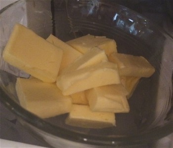 Then he cut up chunks of butter and put them in the freezer on ice. This will make the pats of butter easier to pull apart when he puts them on the steaks during grilling.