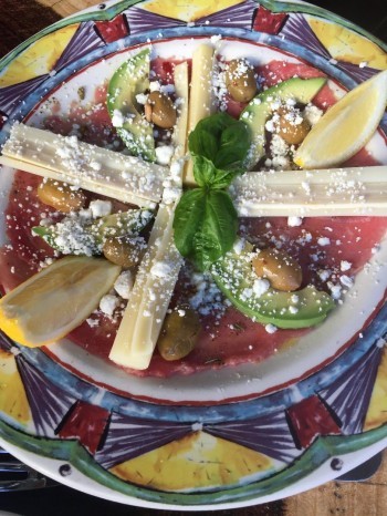 Giuseppe paired wines with each of our courses. For appetizers we tried a variety of creative dishes: Polipo Alla Griglia, grilled succulent octopus on a bed of beans, potatoes, garlic aioli, and topped with a pesto sauce; Funghi Ripieni, mushroom caps stuffed with crab, peppers, bread crumbs, onions, herbs, and parmigiana; Carciofi Alla Giudea, artichokes sautéed in lemon butter; and perhaps the highlight of our appetizer courses, Carpaccio Palmito (photo above), thinly sliced filet mignon, hearts of palm, avocado, goat cheese and olive oil. This dish was artistically presented, light, and tasty, but all the appetizers were delicious, especially when savored with a Nobilo Chardonnay from New Zealand.
