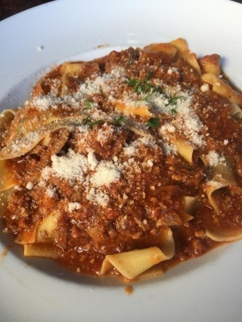 For our main courses we enjoyed Risotto Mascarpone, a wonderful mixture of arborio rice, pancetta, asparagus, and Mascarpone; Pappardelle Ragu e Porcini (photo left), an outstanding pasta dish made with housemade fettuccine with veal beef ragu, porcini mushrooms and topped with shaved parmesan; ; Ravioli di Agnello, housemade ravioli filled with lamb and smothered in a savory sauce made of mushrooms, garlic, and rosemary; and Mezzelune di Melenzane, another unique ravioli variation filled with eggplant and mascarpone in a light tomato sauce. These dishes were paired with Barone Ricasole Super Tuscan, an ideal bold accompaniment with the rich dishes.