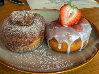 Our last stop was The Country Club, which just opened last December and has already made its mark as an intimate restaurant and bar exuding a private supper club ambiance with its dark wood and leather seating. Its location has been the site for good food and libations for more than 60 years. As an adults-only spot, this restaurant is the perfect place to relax with quiet conversation while sipping perfectly made cocktails. (This might be a good stop for a Match.com first date.) Chef Zachary Scherer brings extensive experience (such as from George’s on the Cove in La Jolla) and has created an appealing, diverse menu. I chose a beautiful salmon salad that was a crispy refreshing choice after our earlier chicken breakfast. Others in our group enjoyed Brioche French Toast, Short Rib Hash, Biscuits and Gravy, and a variety of savory benedicts. Also each week the chef features a special doughnut.