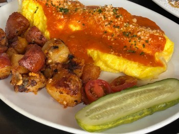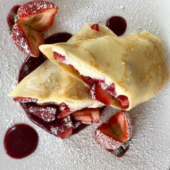 Our dishes included a crispy Artichoke Hearts of Palm Salad (Did I say how much I love to find hearts of palm in a salad?); Quattro Fromaggi, a four-cheese, grilled sandwich made of mozzarella, gruyere, pecorino and goat cheese with shitake mushrooms, arugula and a tangy Pomodoro sauce; Lengua Omelet, made of slow cooked beef tongue, Queso Fresco, spicy tomatillo salsa and pickled serranos; an Open Faced sandwich on a fresh biscuit with chicken sausage, eggs, chipotle gravy, Queso Fresco and potatoes; Baked Caramel Apple French Toast; a Pizza Omelet, and for dessert, strawberry crepes, and sweet ricotta mousse crepes with caramel sauce.