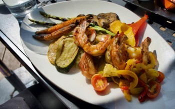 image-rightFor our second course, we tried all three choices. Linda said the Maple & Ginger Glazed Salmon was perfectly seasoned. It was creatively served with a soy glaze on jasmine rice with a cucumber daikon relish. Todd finished every bite of the tender New York Medallions served with a wild mushroom risotto and topped with a Cabernet Sauvignon sauce. My Shrimp Mezza Plate was almost too beautifully presented to eat. The huge roasted shrimp were highlighted by grilled vegetables that had marinated in an herbed artichoke tomato tapenade. And as an extra treat, the Dine Diego menu offers a four-ounce lobster tail for only $10 more with any entrée.  Since Linda and I are lobster connoisseurs, we could not turn that down and it was so fresh and tender, dipped in melted butter of course.