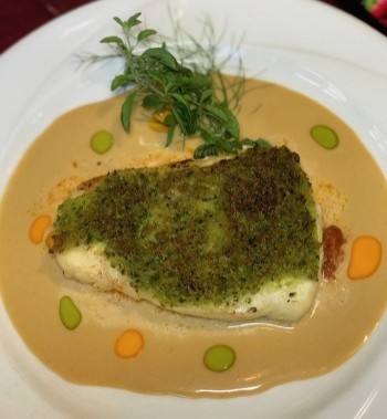 It seemed impossible that Chef Pascal could top these first two extraordinary courses, but he did. Our main course, Seabass au Thym, was superb. The crust topping the fish was made of a savory mixture of thyme, parsley, garlic and butter. The fish with its bright green topping sat atop chopped tomatoes (tomato concasse) and was swimming in a rich seafood sauce made of Chardonnay, cream, and a broth made from mussels and shrimp. This classic French sauce was a perfect accompaniment to the delicate fresh seabass. Have I ever enjoyed a French sauce more? I doubt it. (Well, I was in Paris about 25 years ago and recall a sauce that might have come close.)