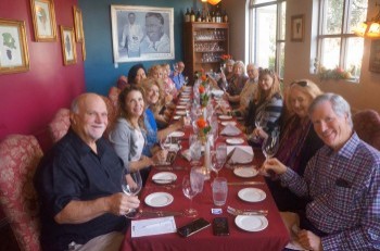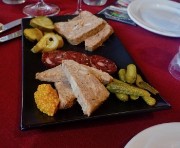 Our table was beautifully set for 15. We were first treated to a charcuterie platter featuring house-made pistachio country pate, tender pork rillettes, and duck sausage with house-made mustard, and pickles made from local, farm-picked cucumbers. I doubt if I have ever had a more appealing charcuterie platter. The combination of herbaceous and earthy flavors with the tang of the mustard and sharpness of the pickles was wonderful. We were also served small onion tarts and pesto tomato tarts, which were flaky and delicious. It was hard not to fill up on these appetizers, but I knew we needed to save room for the special dishes to come.