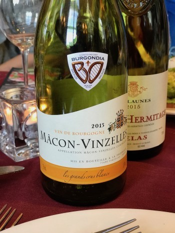 The salad and appetizer courses were accompanied by a lovely 2015 Vin De Bourgogne from the Macon-Vinzelles vineyards. This crispy, fruity White Burgundy was a particularly nice complement to the fresh salad. My approach was two bites of salad and then a sip of wine—an approach that worked beautifully.