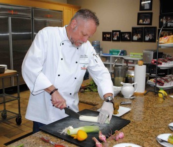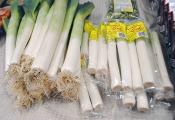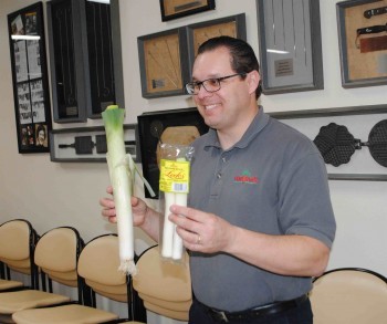 Robert Schueller gave us a mini lesson on preparing leeks for cooking. Big Belgian-style leeks are a new product distributed by Melissa’s. I have always enjoyed leeks because they are milder and sweeter than onions, but cleaning them can be a challenge since dirt accumulates between layers. Robert advised us that it is easier to clean leeks by cutting them up before washing them. (Only the white part is edible.) Making preparation even easier for the consumer, Melissa’s provides leeks already trimmed, peeled and prewashed. I was happy to learn that leeks can be successfully frozen after cleaning them. So right now our freezer has lots of leeks awaiting soups, sauces, and stir frying.