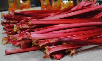 Toward the end of our visit, we were introduced to the sweet and juicy Ojai Pixie Tangerines, which grow very well in the Ojai Valley and are abundantly available right now in supermarkets. But my favorite fruit was the vibrantly colorful, fresh rhubarb. Following Robert’s suggestion, at home I heated cut and cleaned rhubarb in a pan on the stove until it melted and then added sugar. The result was a delectable rhubarb syrup to pour on ice cream or even use as a topping for pork or lamb. Robert warned us that, unlike beet greens which are edible, rhubarb greens are poisonous.