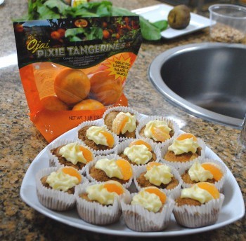 The chef also served two unique salads: one made with Melissa’s ready-to-eat, French Country Style Beets, artichoke hearts, and tomatoes with Roquefort dressing, and the other with grilled shrimp, fava beans, and roasted parsnips served on arugula and sprinkled with fresh basil and Italian vinaigrette. Delicious strawberry-rhubarb muffins were another special treat with a slice of Ojai Pixie Tangerine atop buttercream frosting. We loved actually tasting dishes using the fresh vegetables and fruit we had been discussing.
