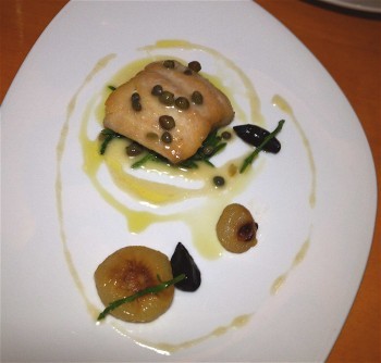He loved its tenderness and intense flavor, especially with his bold red wine. But we both also raved about Lavarello, seared whitefish in a lemon-caper sauce accompanied by roasted baby onions, sea beans and black garlic. We especially enjoyed the sea beans, which we had never tried before.