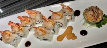 Umi offers such an enticing menu of Sushi, Sashimi and Maki rolls that it is hard to choose. We know they are all delicious and made with the freshest seafood. Todd loves Spicy Tuna Rolls so that was one of our choices. The tuna had a pleasant tang, which was mellowed by the avocado and cucumber. The chef also made a special roll for us with crab, topped by a sliced scallop and tiny shrimp with crunchy fried tails. My advice to you is to ask one of the helpful sushi chefs what they would recommend, based on your preferences. You could certainly make a meal out of several rolls.