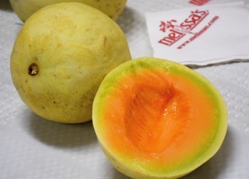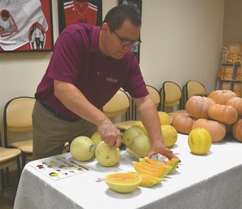 On to the melons. We learned that there are more than 16 different varieties of melon, not just your standard watermelon and cantaloupe, and that they all have distinct flavors. Robert cut open several of these melons for us to taste. We tried sweet Orange Flesh Honeydew melon and zingy Lemon Drop melons that had a wonderful sweet/tart taste. Robert pointed out that there are numerous melon varieties available in many grocery stores, each with distinguishing flavors, including Charential, Korean, Crenshaw and Galia. I’ll be looking for these melons in the grocery store.