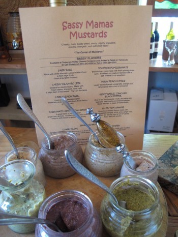 But our group of writers (from the International Food Wine and Travel Writers Association) was tasting mustards for their distinctive flavor combinations and pairings with some excellent cheeses. The mamas call their mustards “cheeky, lively, and boldly smart” and they are all that and more. Kat and Shawna create the mustards themselves in the small kitchen at Temecula Valley Cheese Company using fresh, locally sourced ingredients. The beers and wines they use are local and mustard seeds are supplied by Old Town Spice & Tea Merchants.