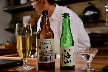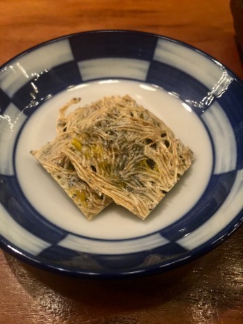 Our first course consisted of small wafers made of dried Japanese baby anchovies and seaweed. Chef Hiro explained these wafers were good for digestion. They were tasty with a salty zest and nice crunch. Sips of the chilled sake and beer from Niigata also helped with digestion.