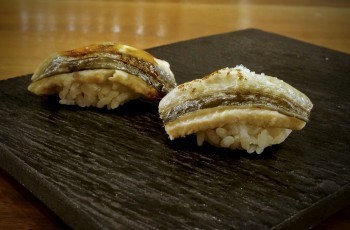 Two unqiue preparations of eel, one with sea salt and lemon juice and the other with Japanese pepper, were both served with Chef HIro's special rice with red vinegar, and had lovely subtle sea flavors.