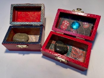 A special touch were the tiny boxes lined with Japanese paper at each guest’s place setting. Todd meticulously created these boxes as favors to take home. We placed a single stone with an inspiring word in each box. During dinner, we went around the table and each person read his or her word and made a few comments about the word. The words encompassed our human experience — such as Trust, Love, Courage, Joy, and Peace. It’s fun to have a conversation starter like this, but our group is pretty vocal without much urging.