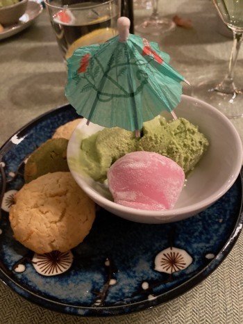 The dessert was very special and included green tea ice cream, mango and pineapple mochi balls, and homemade coconut and matcha tea cookies. The festive dessert presentation enhanced this last course of our wonderful Japanese meal.
