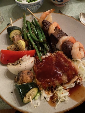 The main courses were Tonkatsu, a traditional deep fried pork dish, and teriyaki-marinated filet and shrimp kabobs, along with colorful vegetable kabobs, all served to each guest on a traditional Japanese plate with crisp sesame green beans. Of course sticky white rice was also in a small bowl at each place setting.