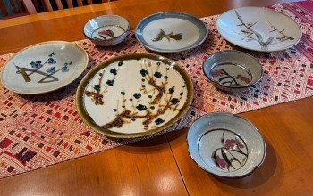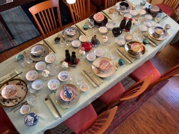 The most challenging part of the evening was setting the table with multiple bowls and plates and glasses for our various courses. Fortunately, we had brought back lots of lovely traditional pottery from Japan and this was the ideal chance to put these precious pieces to good use. So what if a few of the plates had suffered small chips over the years? These plates reflect the unique and lovely Japanese concept of shibui where the beauty of an object may grow over the years and its subtle imperfections add to the artistry of the bowl or plate.