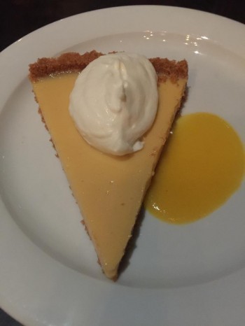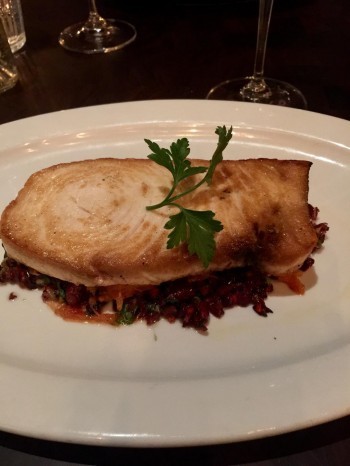 The Restaurant Week menu includes four entrées: salmon, scallops, swordfish, and chicken. One of the entrées we selected was the Wild Eastern Sea Scallops topped with soy brown butter and accompanied by a cauliflower puree. The scallops were cooked to perfection, something that doesn’t always happen with scallops. The flavor combination of the soy butter and scallops was a perfect match. Our other entrée, Wild Pacific Swordfish with Spaghetti Squash, sat atop a delicious olive tapenade that was a salty juxtaposition to the buttery and meaty swordfish (photo to right).