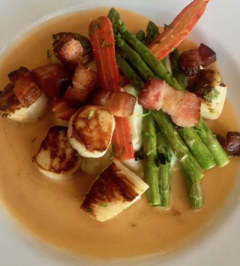 We also enjoyed fresh Dungeness crab in delicious Crab Cakes and creative Duck Mac ‘n Cheese made with gruyere and smoked cheddar. We shared the Lardon Salad with crisp greens, lardon bacon, garlic croutons, gorgonzola, and a warm Dijon-sherry vinaigrette. For entrees, Todd savored the Seared Scallops served with bacon, asparagus, mashed potatoes, and fresh tarragon beurre blanc. I really liked the savory Cauliflower Steak inventively prepared with melted cheese curds, a roasted tomato relish, Kalamata olives, olive oil, and lemons. It was so nice to take a leisurely, after-dinner stroll back to our Sea Star Loft accommodations.