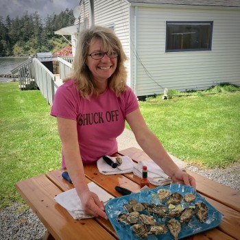 One of the highlights of our visit to Orcas was a stop at Buck Bay Shellfish Farm, where oysters, clams, and Dungeness crab are harvested and sold, along with homemade ceviche, salads, and other seafood. The enthusiastic and knowledgeable owner, Toni Hermansen, gave us a tour and showed us how to shuck oysters. As we watched her shuck, we sat at picnic tables and enjoyed those freshly shucked oysters (so yummy!) along with a lunch of cheese, olives and wine that we had picked up the day before at Roses Café. It’s a good idea to call ahead to let them know you are coming. You can also stay all night in a comfy one-bedroom cabin right on Buck Bay. I can just smell the fresh air and taste those fresh oysters right now.