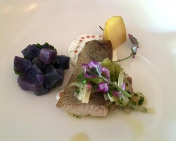 At Mr. Lyons Steakhouse we were greeted by innovative Executive Chef Eddie Moran, who had prepared a delectable menu of small plates expertly paired with wines selected by Jessie Casanova. Course one was an attractive variety of radishes and herbs topped with blue cheese. This was paired with Marco Felluga Mongris Pinot Grigio ’17, a medium bodied white wine with an apple blossom bouquet. Course two, was a Black Cod Escabeche (similar to Ceviche, but the seafood used in Escabeche is poached) with a dill crème fraiche (photo right). This dish was paired with a seafood friendly red, La Follette Los Pimeros Pinot Noir ’16. Berkshire Pork Belly with rhubarb, fennel, and Aperol was our third course. The juicy, rich pork belly was paired with Margerum M5 Red Blend ’16, a luscious Grenache and Syrah blend.