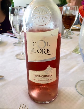 We began our tasting experience with a medium dry rosé, Cave de Roquebrun Col de l’Orb Rosé, Saint-Chinian 2016. Made from 65% Syrah grapes and 35% Grenache grapes, the rosé had a floral bouquet, and a refreshingly fruity flavor with a hint of spice. Chef Pascal paired it with a fresh beet and goat cheese salad served with a balsamic reduction, homemade country pâté with pickled vegetables, and a delightfully earthy mushroom soup.