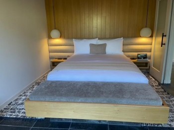 This suite included almost every amenity possible except a TV, which we did not miss at all. It was nice to tune out the news of the day and enjoy our quiet retreat. The soothing palate of subdued colors enhanced the serenity of our room; even our dog was ready to curl up and take a snooze. There were bottles of cocktail mixes to purchase in our room so we enjoyed drinks as we embraced the restful atmosphere. My husband and I agreed that Azure Sky provided a much-welcomed escape from our busy, daily lives.